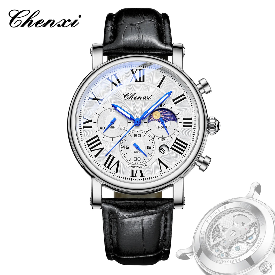 Watches For Men Leather Sweeping Second See-through Quartz Movement Waterproof Moon Phase Chronograph Wristwatch Men's Watch
