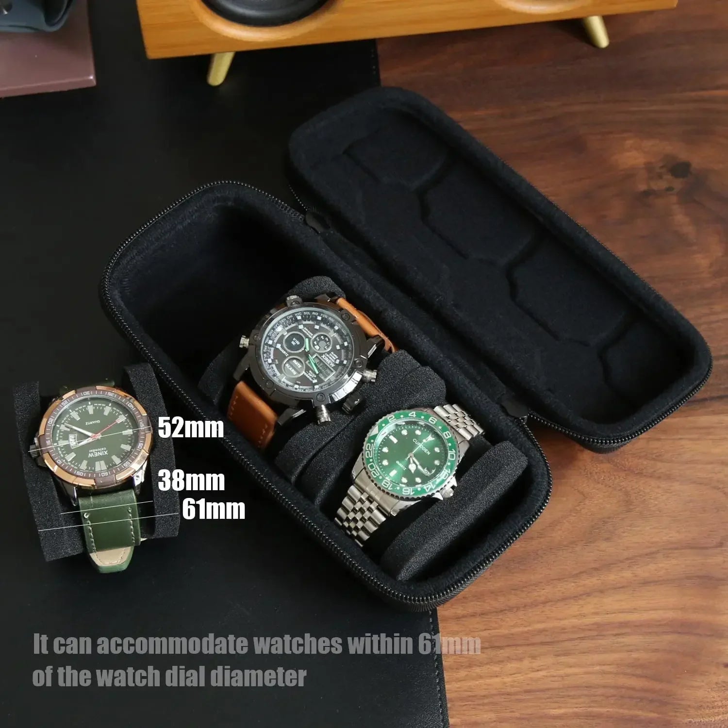 5 watch travel case size is 13.6"L x 3.77"W x 3.15"H (347 x 9.6 x 8cm)and comes with 5 sponge pillow that can be compressed,Accommodate watch bands up to 19cm long and watch faces up to 61mm in diameter, suitable for men's watch, women's watch, smartwatches, fitness trackers, or luxury watches. The box is equipped with a smooth YKK zipper, ensuring easy opening and closing. The watch pillow is made of pure sponge, suitable for small wrist sizes as well.