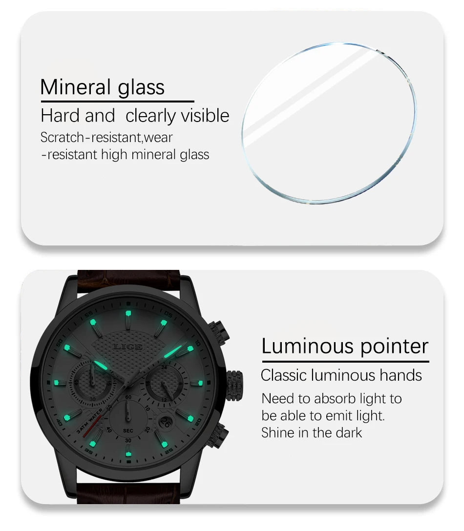 Watches Mens 2025 LIGE Top Brand Luxury Casual Leather Quartz Men's Watch Business Clock Male Sport Waterproof Date Chronograph